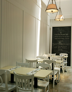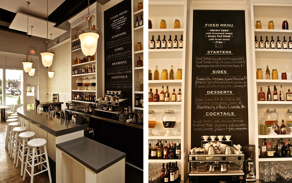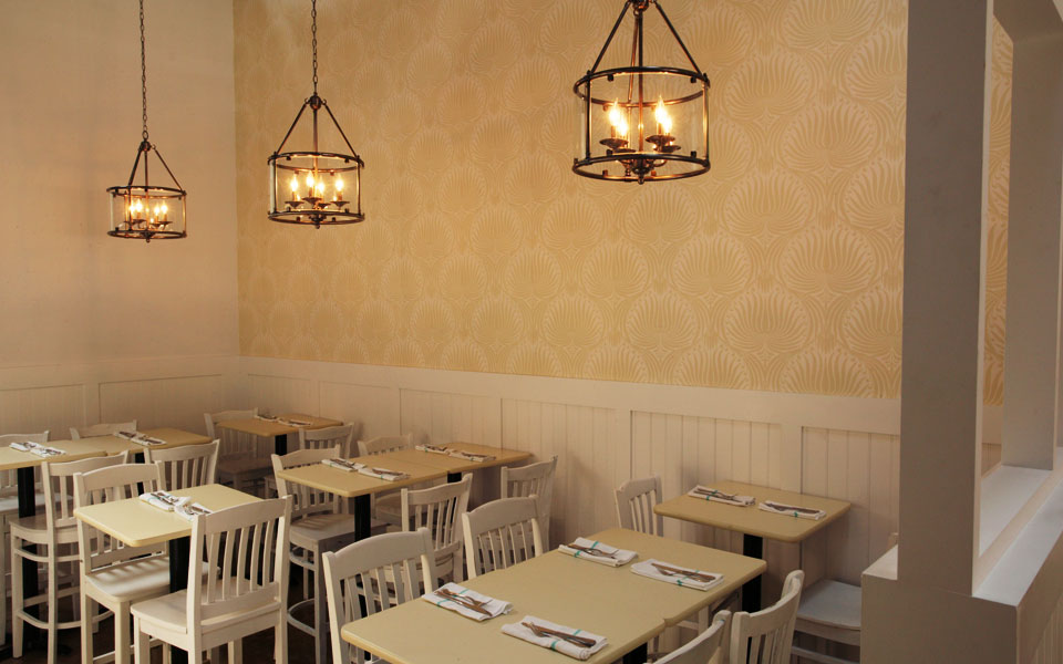 "A visual balance was created with the application of a beautiful airy wall covering found in the entry and middle high top dining area and intervals of bead board were employed throughout the restaurant to give a cohesive look to the overall interior design."