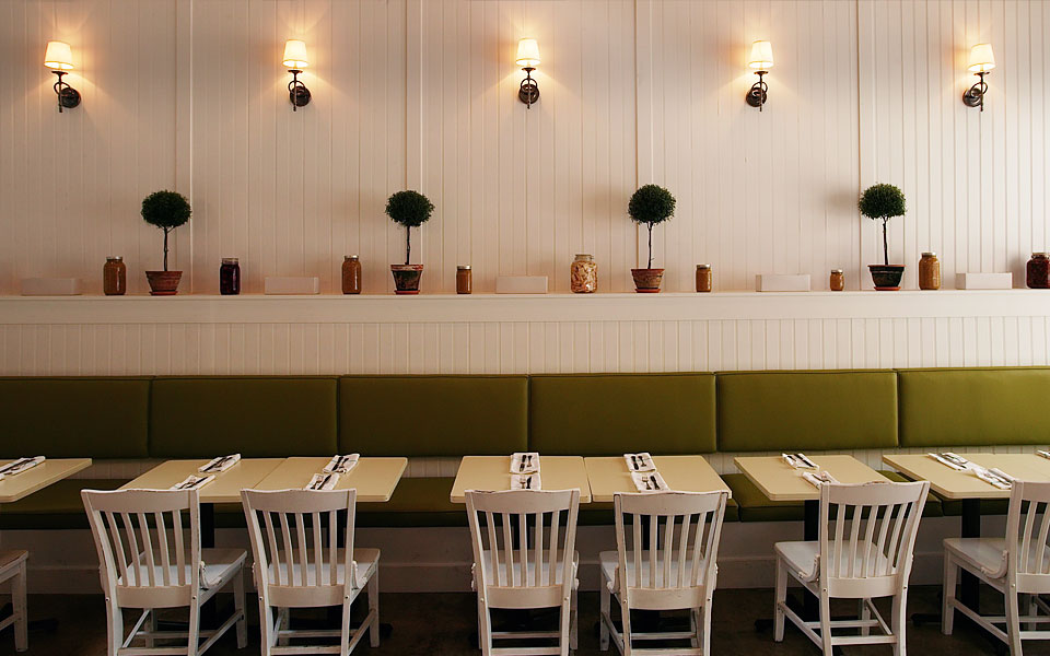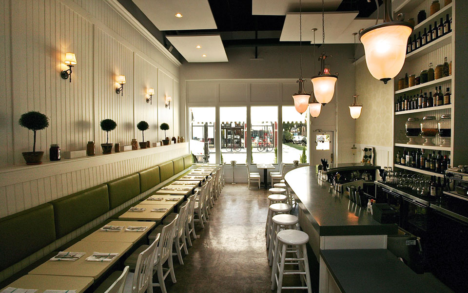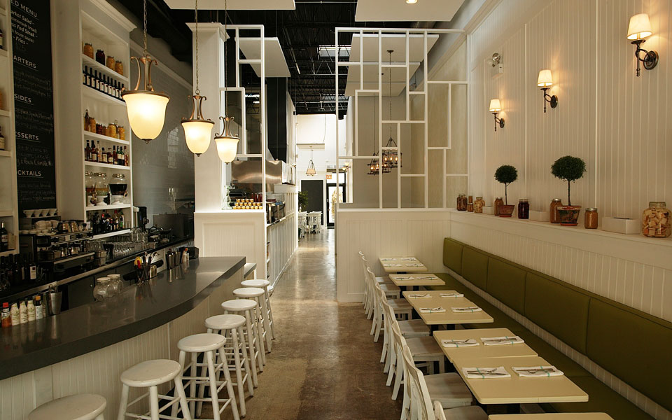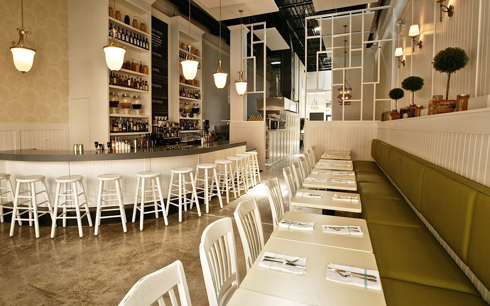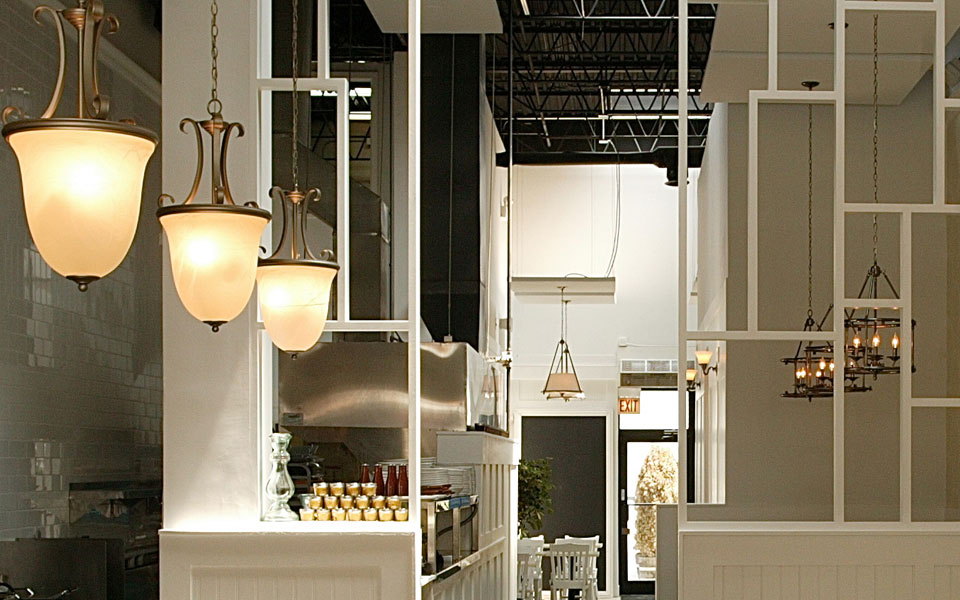 A furniture plan was designed to allow for four specific areas of dining within the open plan that included a bar, front of house dining, a middle area of high top dining and a casual back of house dining setting. A simple color scheme of white on white with accents of a fresh green tone; that took the lead from the restaurant’s name, was incorporated into the restaurant’s interior. Ceiling clouds were hung at 15’ above the finished floor from 20’ ceilings to offer a more human scale environment. Working with vertical intervals of 5’ up to 15’, a rhythm was created throughout the space by utilizing different wall treatments to integrate the space. A beautiful lattice treatment was designed to visually signal the separation between the bar and front of the house towards the middle and rear areas of the restaurant and further worked within the scale and play of vertical heights. Pewter toned accent lighting was selected and companion pieces were installed within the four dining areas to further differentiate these spaces. A completely distinctive and unique branded environment was designed that offered the restaurant clientele various areas for enjoyable dining experiences.