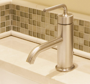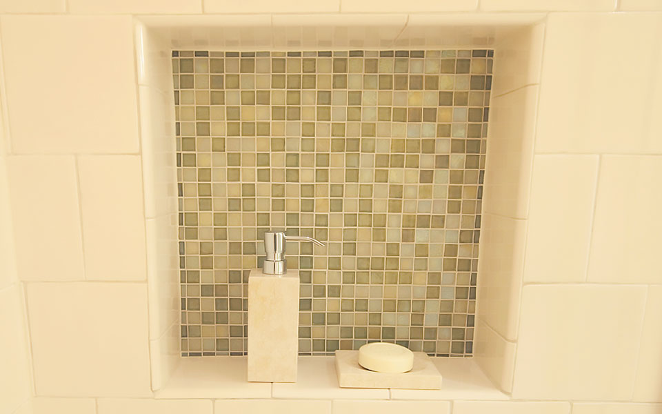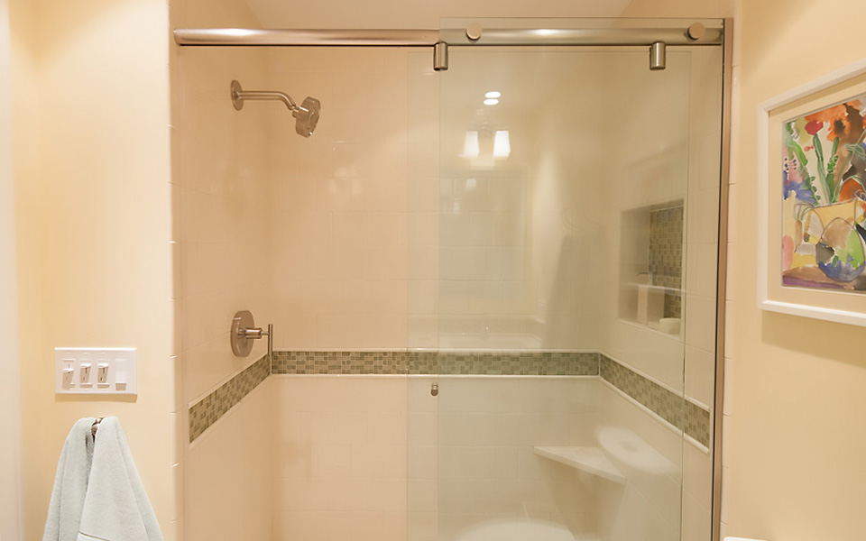 A pale green and yellow palette culminates in the selection of the mosaic blend for the sink backsplash, shower accent border and niche. The mosaic blend coordinates perfectly with the pale glow of the shower’s field wall tile. An expansive double sink vanity was designed for its clean lines and offers plenty of storage. Contemporary selections for faucet, shower fixtures and frameless bypass shower door combine with the traditional vanity and lighting elements to create a transitional space.