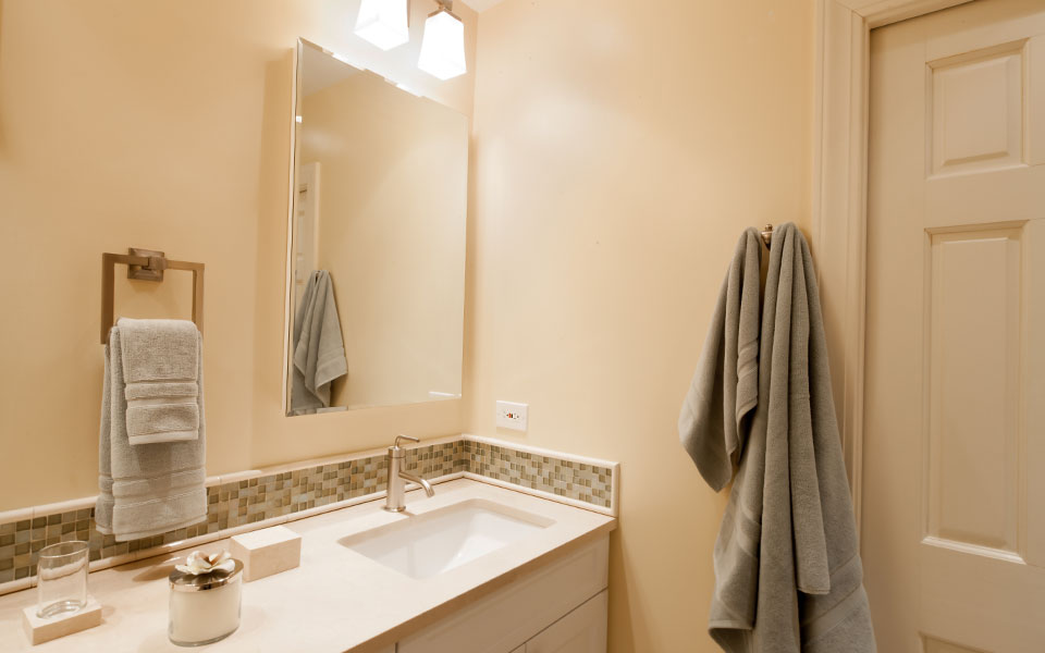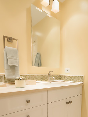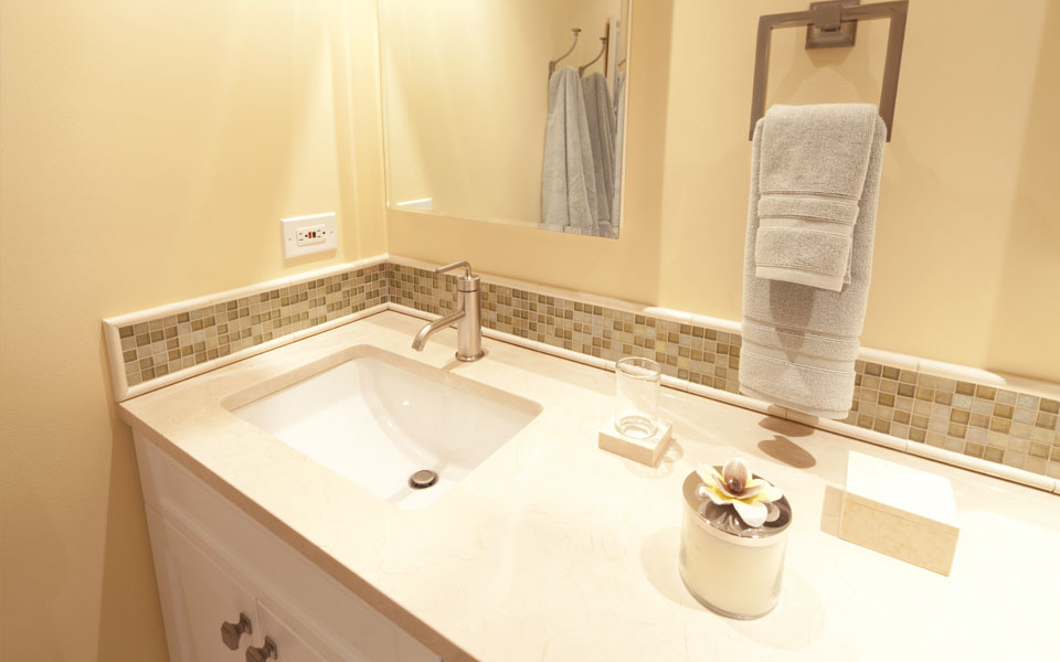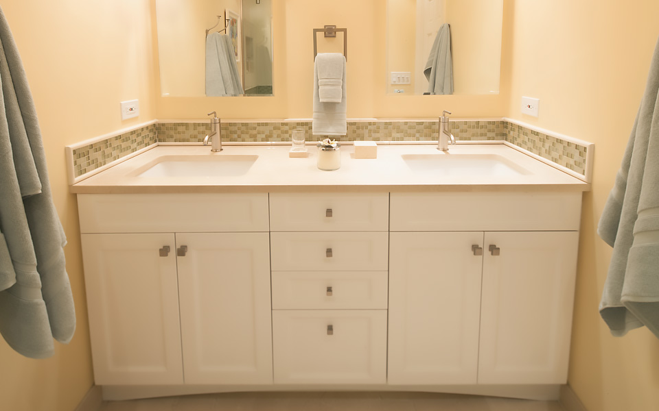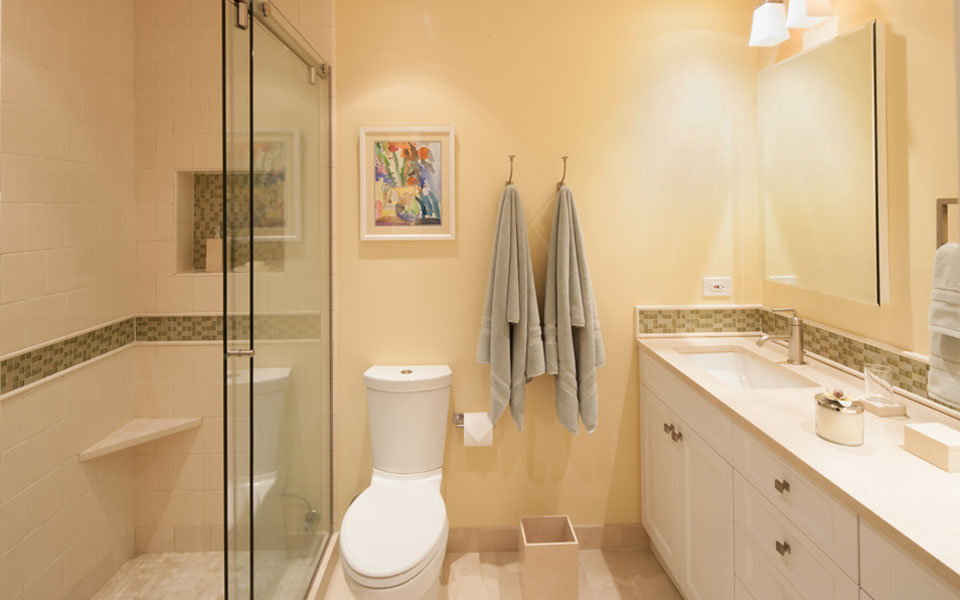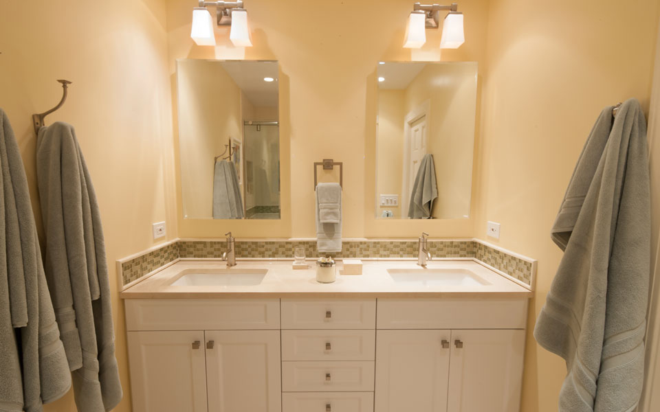 Completely transform and remodel bathroom into a welcome respite. Create a pale palette that reinforces a sense of calm. Select finishes and fixtures that coordinate and unify the interior design with transitional styling. Increase storage to help with organization.