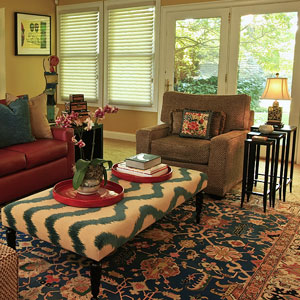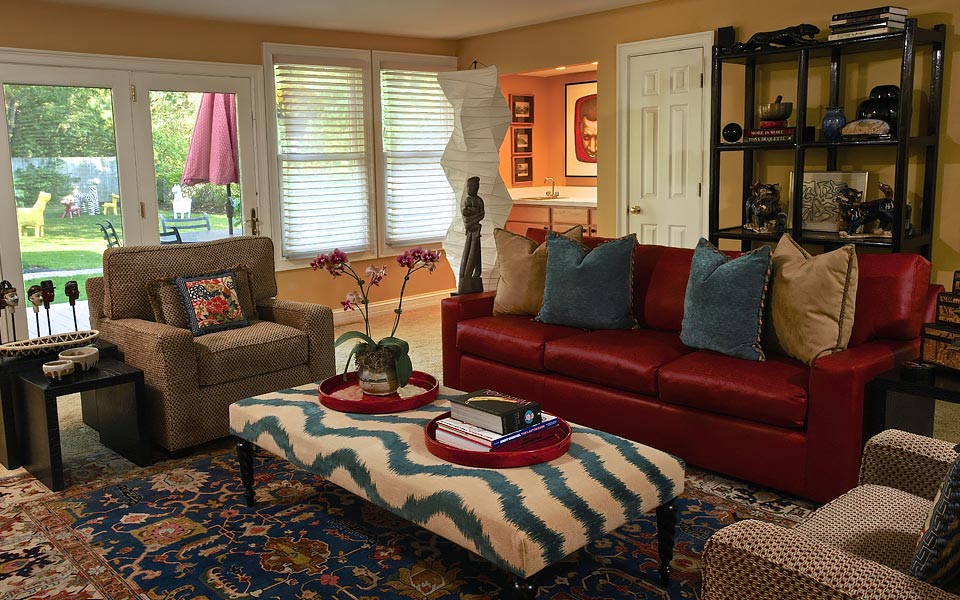 Living spaces are connected visually through a toned down primary color palette that takes its queue from Client’s heirloom Persian rugs. Fabrics are selected that support the color palette while providing interest with various textures and trims.