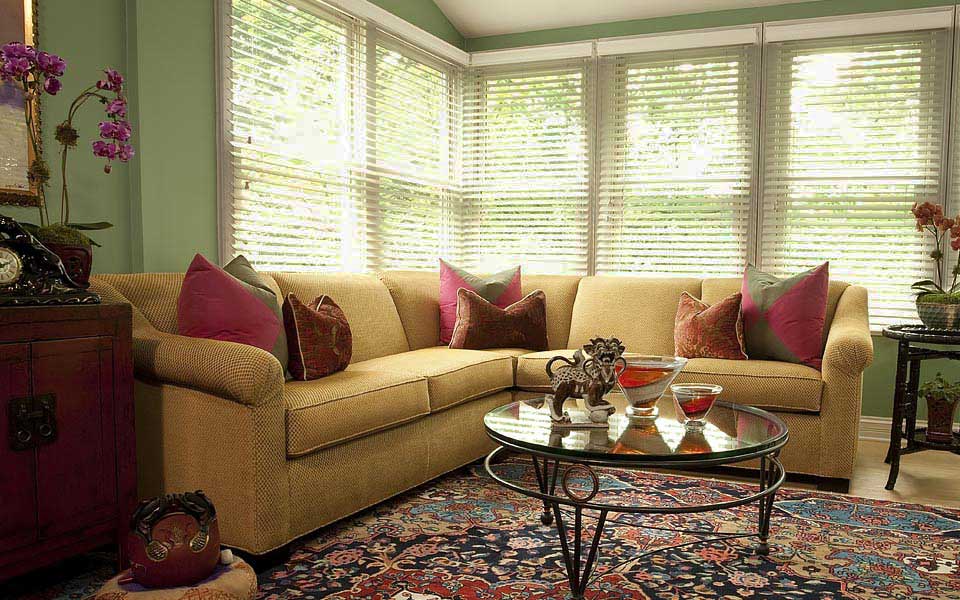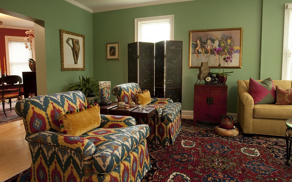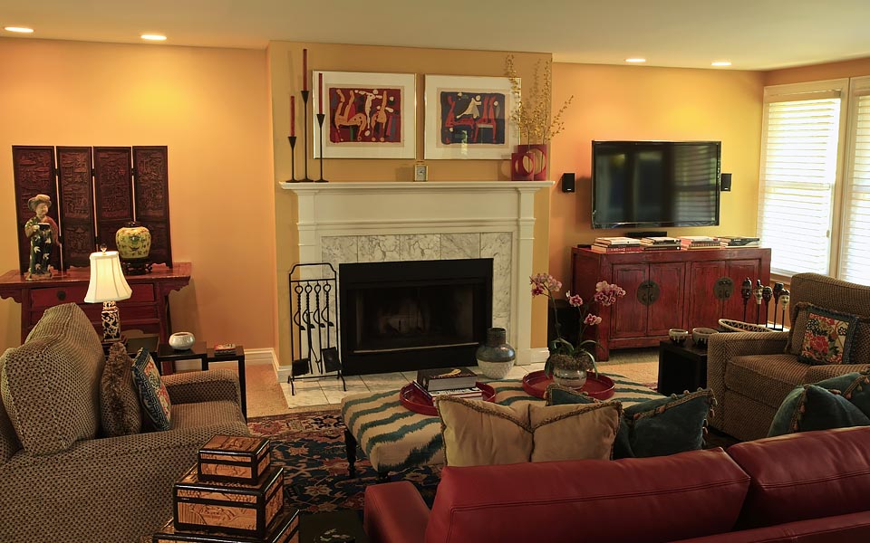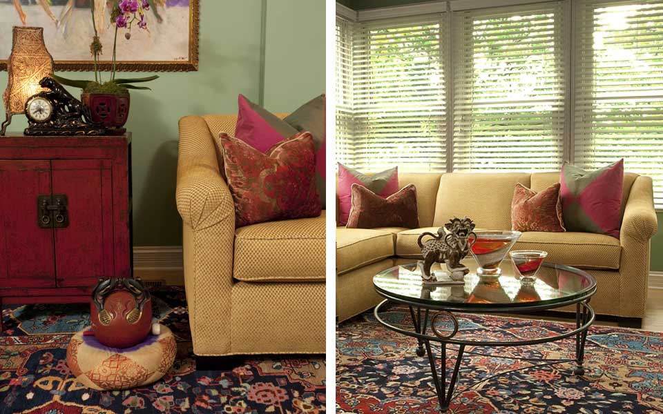 Asian antiques are placed and coordinated throughout the first floor with custom seating and custom cushions to fashion a uniquely designed interior.